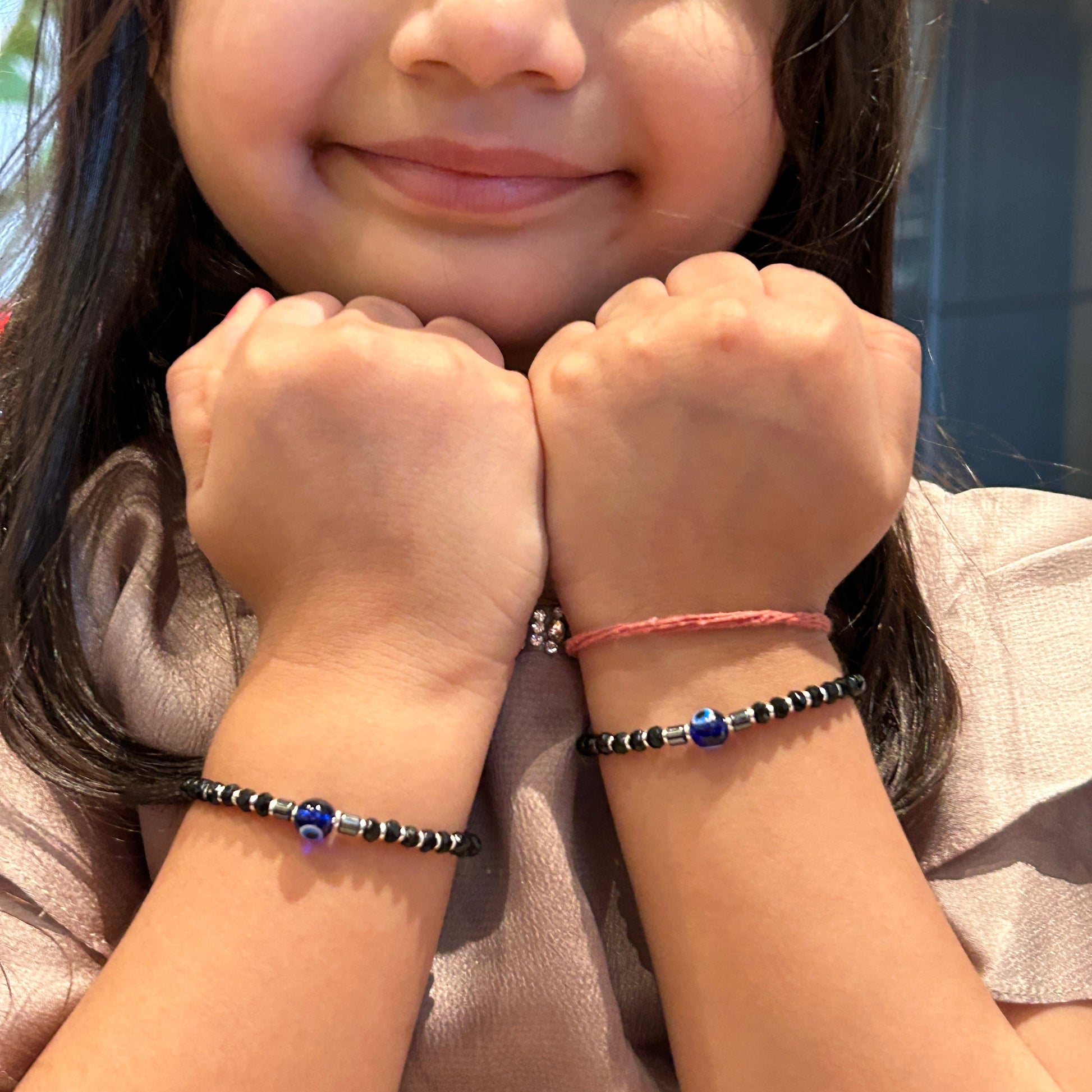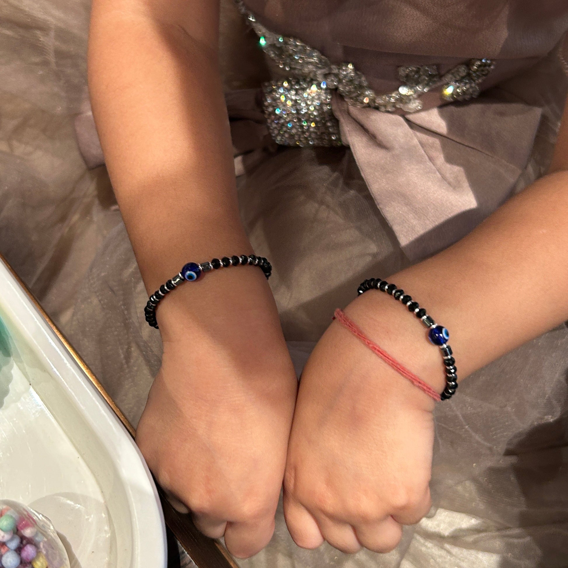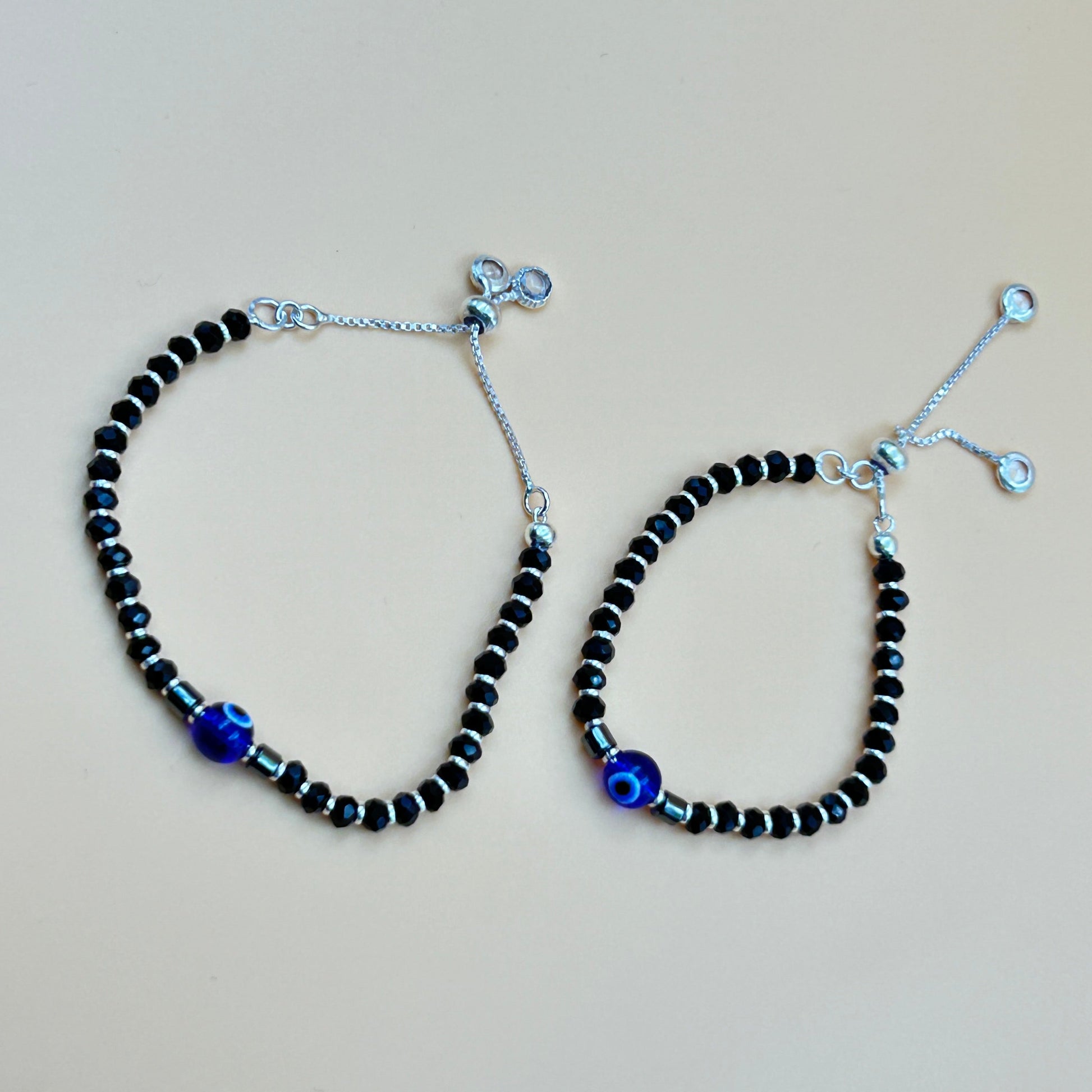 Silver Evil Eye Baby Bracelet - Adjustable Black Beaded Bracelet / Kada